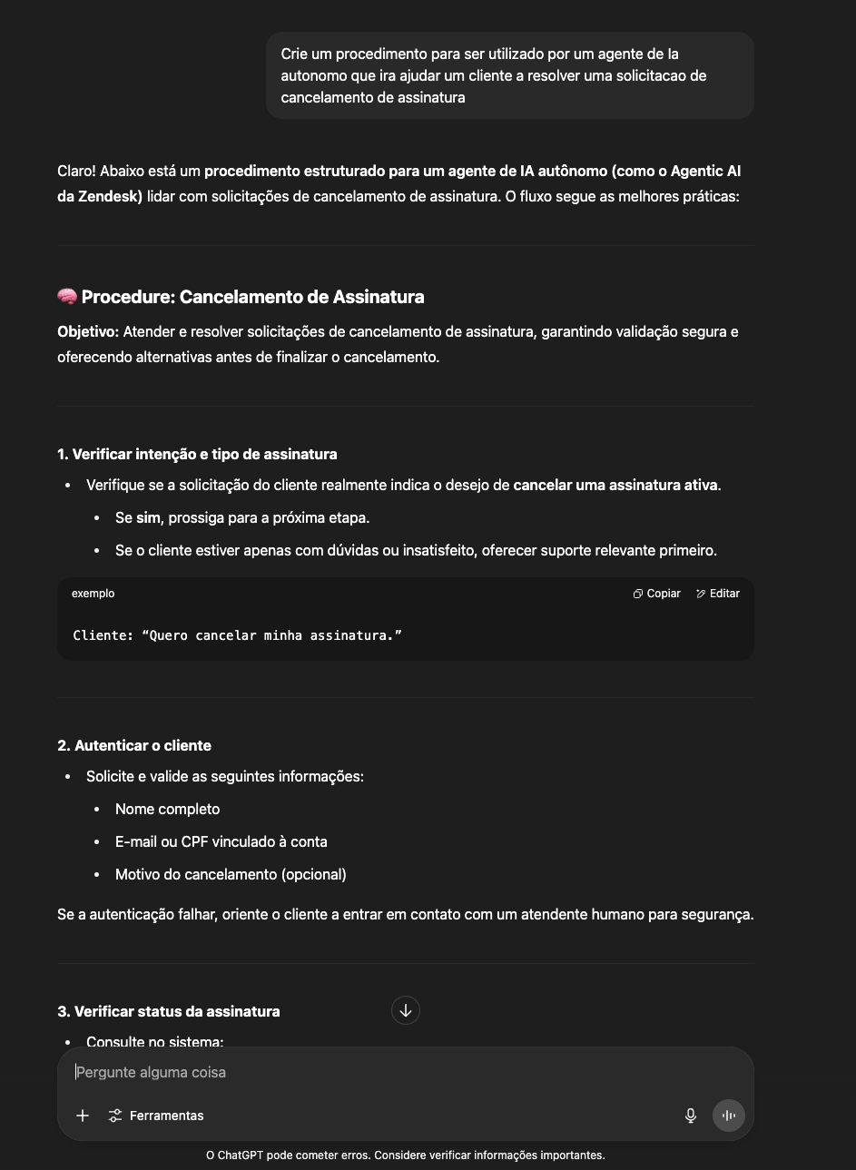 Use o ChatGPT para rascunhar um draft inicial do procedimento, com linguagem direta e clara. Pense em condições, validações, tom de voz e possíveis exceções.