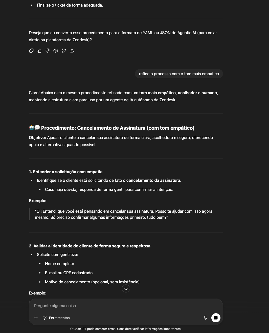Use novamente o ChatGPT para melhorar a escrita do procedimento, garantindo clareza, consistência, empatia e aderência às boas práticas de agentes generativos.